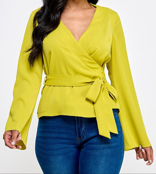 Long Sleeve Surplice Top with Waist Tie