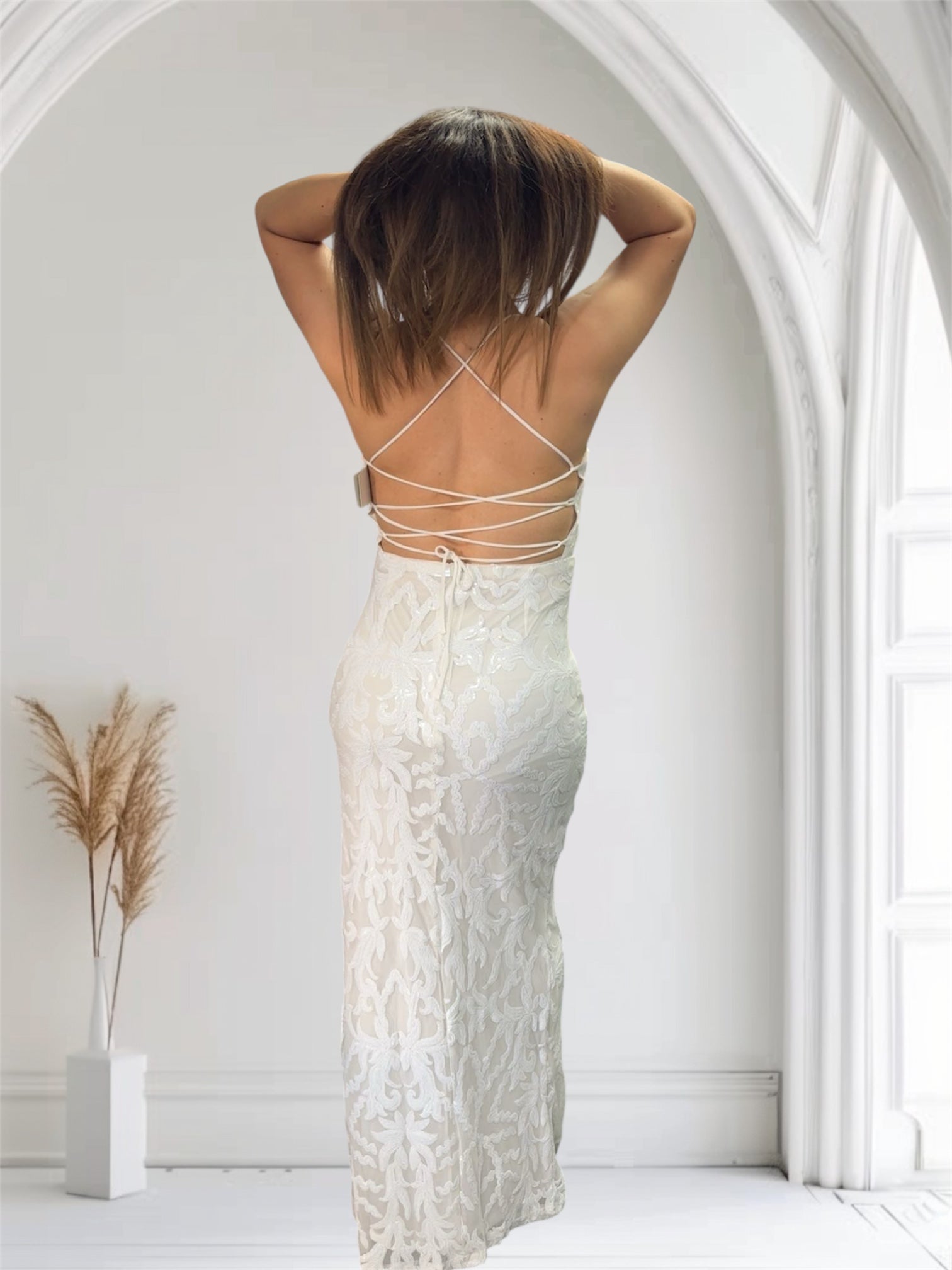 A knit sequin-studded classic couture dress that exudes subtle opulence featuring a scoop neckline, back-crisscross tie design, bodycon silhouette, side slit, and maxi-length.